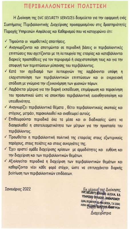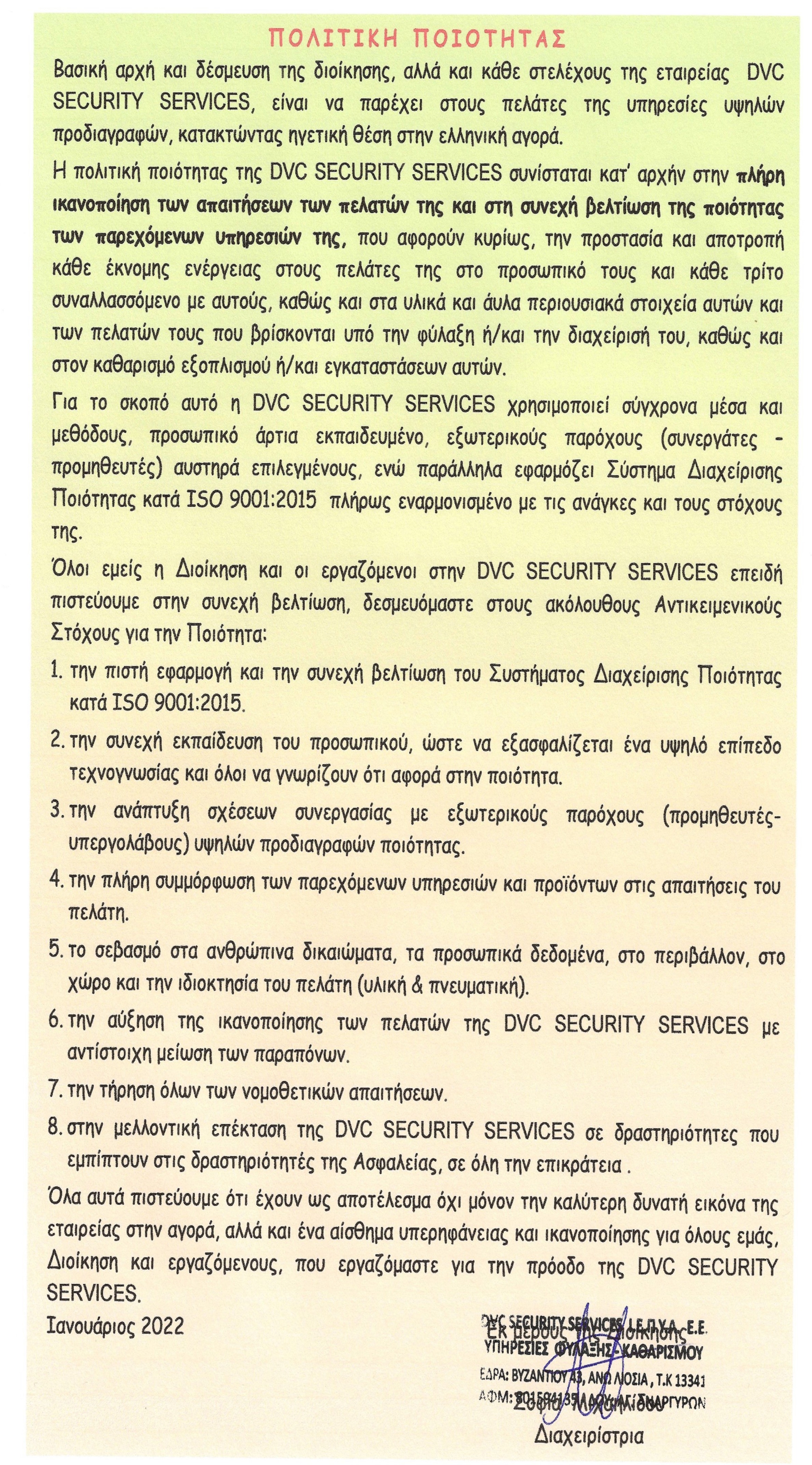 Αποτελεί ευθύνη όλων των εργαζομένων της DVC SECURITY SERVICES να τηρούν όλα τα αναφερόμενα στις νομοθετικές διατάξεις και τις ανακοινώσεις στα ΜΜΕ από τον ΕΟΔΥ καθώς και τα αναφερόμενα στην παρούσα.